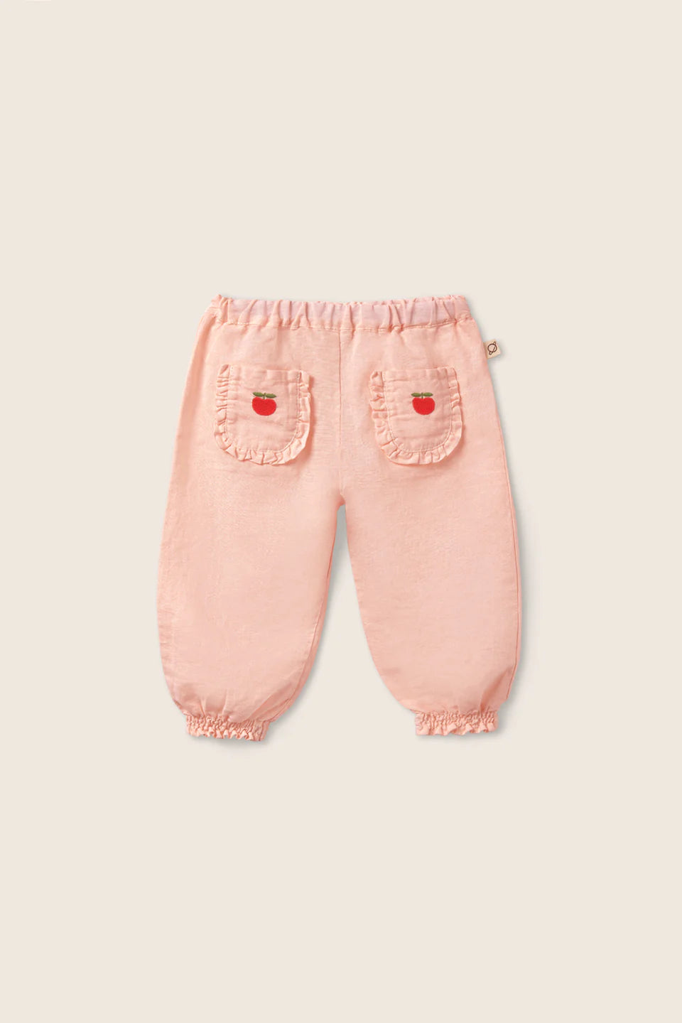 Baby girls’ pants made from a breathable cotton-linen blend. They feature an elastic, adjustable waistband, smocked cuffs, and front patch pockets adorned with an embroidered apple.