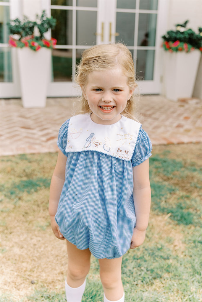 The hand-embroidered piece features the nativity scene on a classic baby girl silhouette. Match big sister in the coordinating dress!