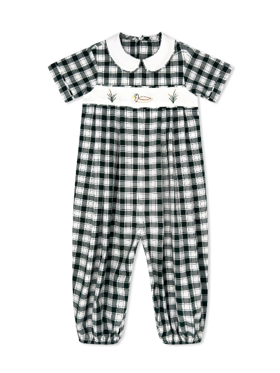 A classic silhouette with a touch of charm, the River Romper is crafted in our timeless Gardner Green check and features a crisp Peter Pan collar. Detailed with mallard embroidery across the chest, it's a polished and playful look perfect for fall outings, family photos, or special occasions.