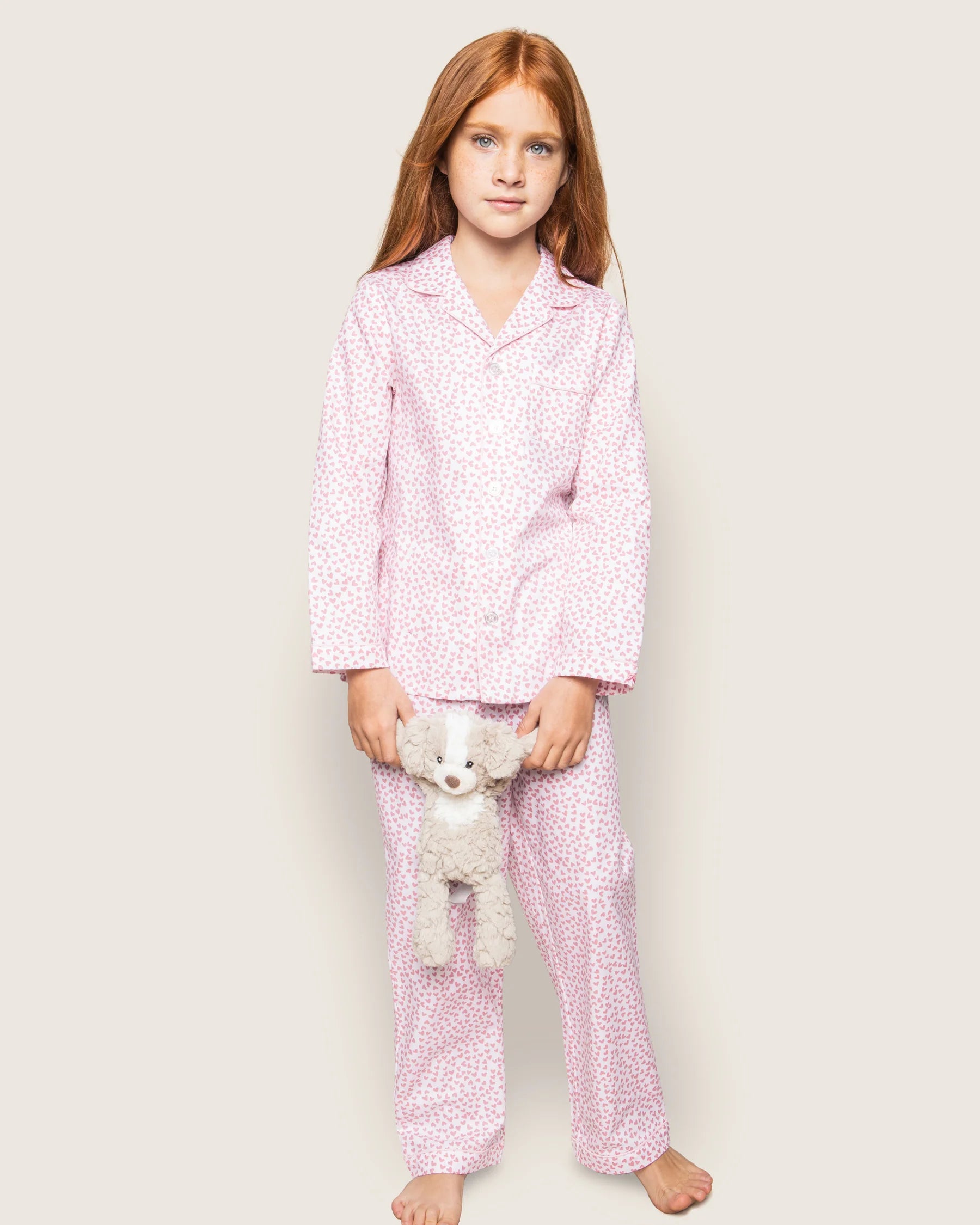 Like joyful confetti, the little pink hearts dance across the fabric as if batting their eyelashes. This classic pajama set is accented with pink piping and finished with pearl buttons.