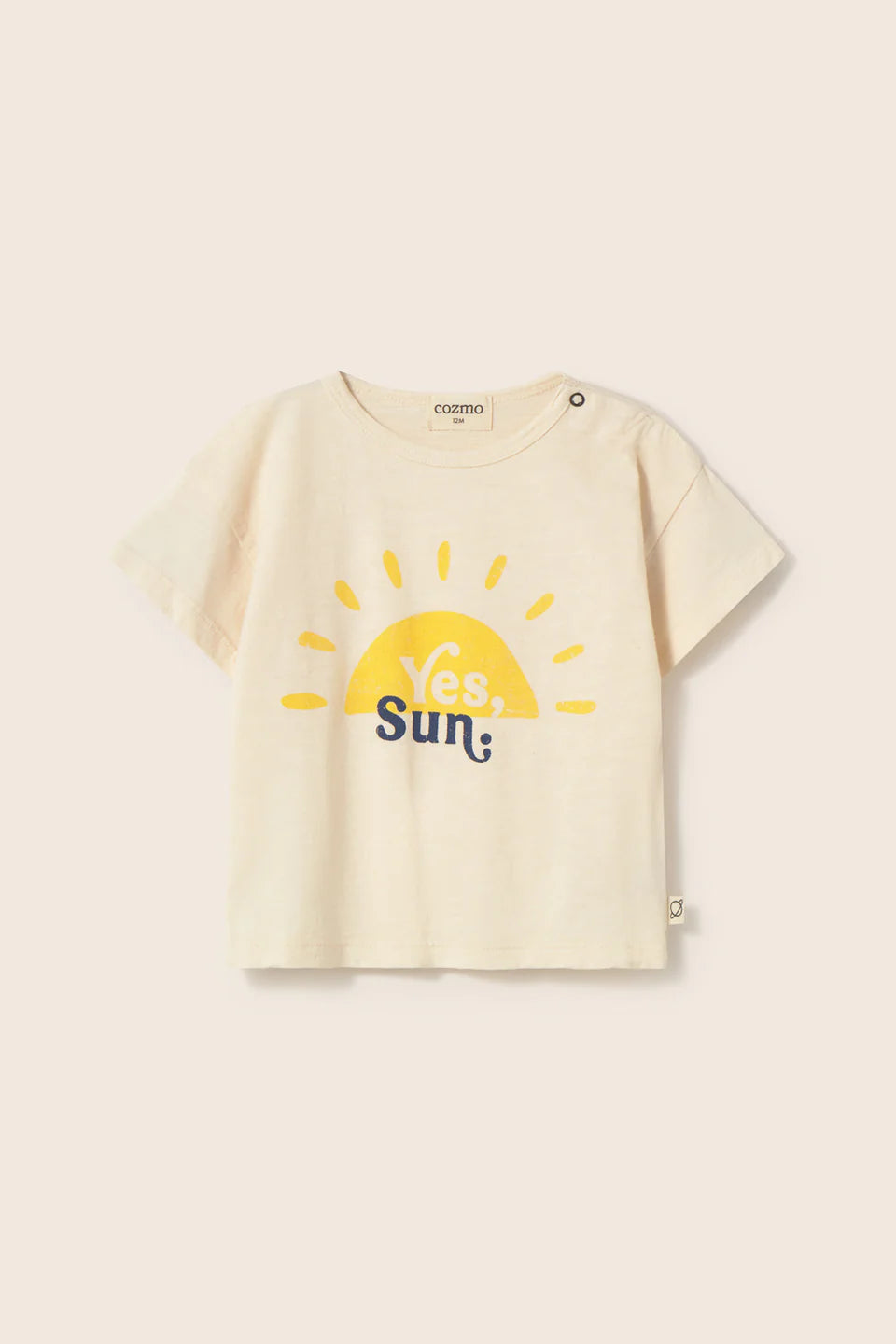 Baby and toddler T-shirt made from very lightweight slub cotton. It features a round neckline with snap buttons on the left shoulder, short sleeves, and a printed motif with a sun and the message “Yes, Sun”.