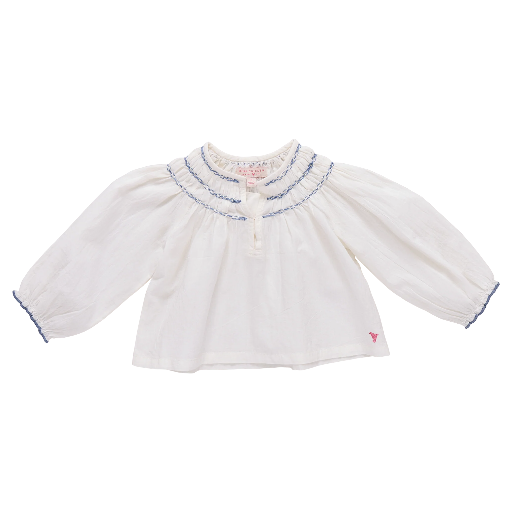 A timeless top with delicate heirloom-inspired detailing! This softly structured silhouette features a beautifully hand-smocked chest design accented with pale blue pearl stitching at the chest and sleeves. Finished with airy ruffle sleeves, this antique white top feels classic yet fresh, making it a versatile piece for pairing with skirts, shorts, or layered looks throughout the season.